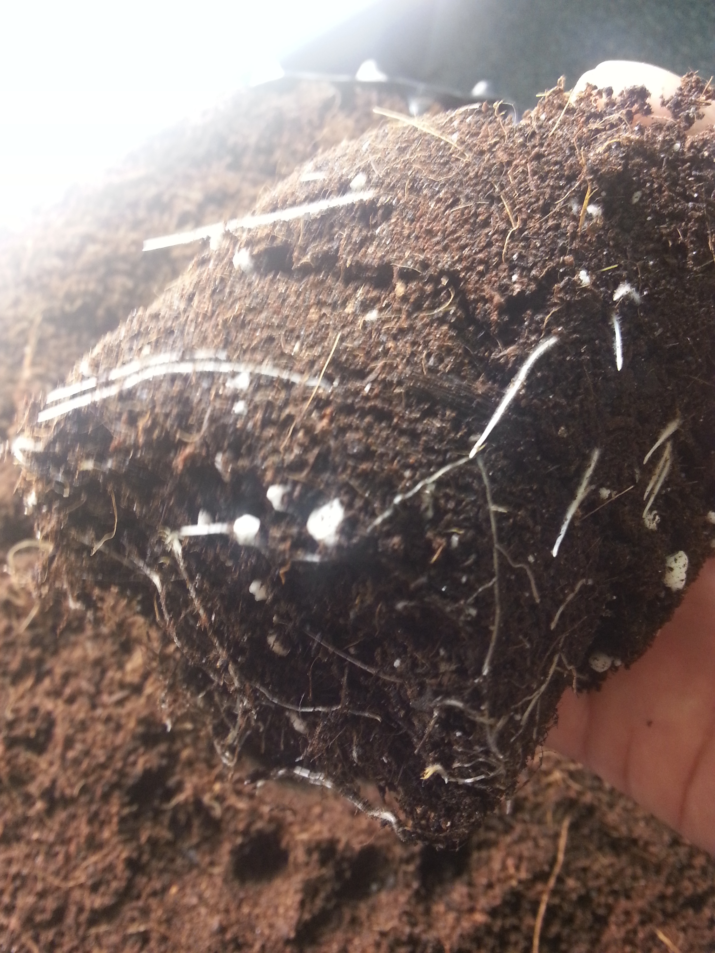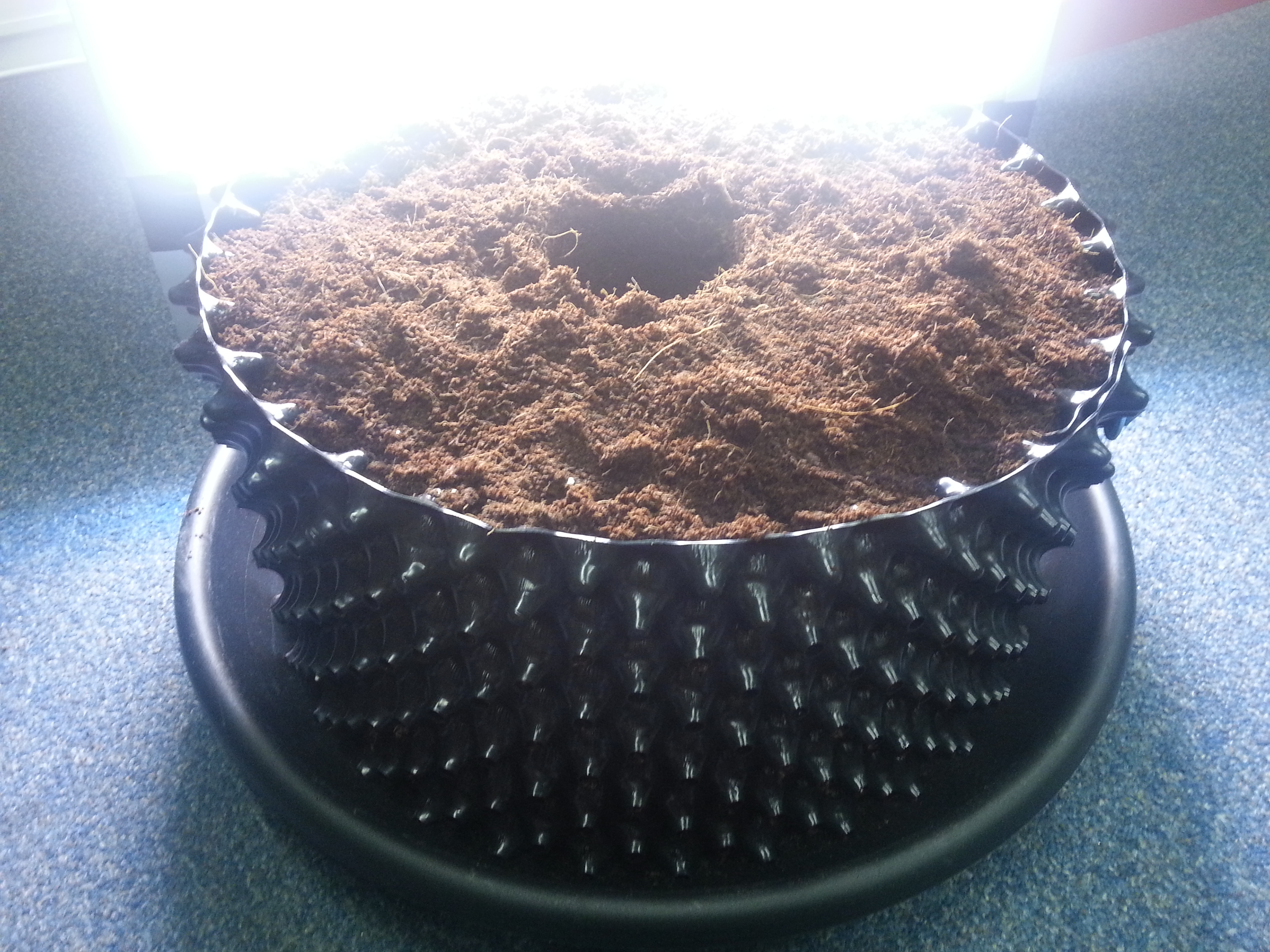 Toen het plantje eenmaal op zijn plek stond, heb ik het vanaf de onderkant (afgezuurd, pH 6) water gegeven en de bovenkant van de pot afgedekt met wit plastic. Dit zorgt ervoor dat het water niet meteen verdampt, en reflecteert het licht ook een stuk beter dan de donkere aarde. Daarnaast gaat het de