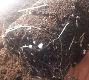 Links zie je de kluit, hij past precies in het gat doordat Dokter Groen eerst het plantje met pot en al had ingegraven. De wortels waren nog maar net aan de randen van de pot gekomen dus de plant heeft er geen idee van dat ie ooit in een klein potje is geweest.