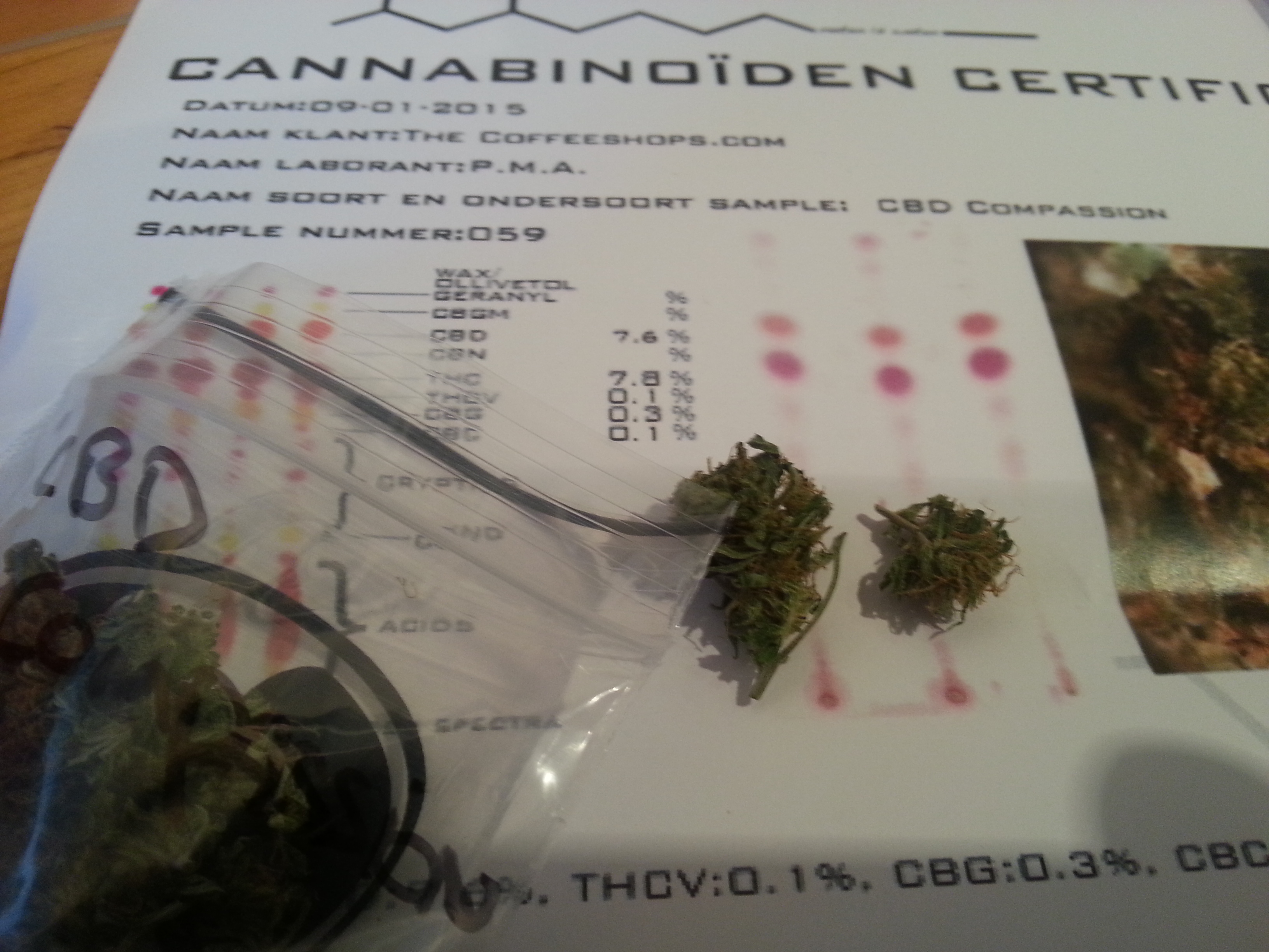 Als een van de weinige coffeeshops heeft Siberië twee CBD-soorten op de menukaart, zoals we ze voor het gemak maar even noemen. Natuurlijk mogen wij ze als founding fathers van deze cannabiswebsite allebei proberen. De eerste soort heet CBD Compassion, en is ontwikkeld door zadenbedrijf Dutch Passion. CBD Compassion heeft volgens het testrapport een 1:1 verhouding van 7,8% THC en 7,6% CBD.