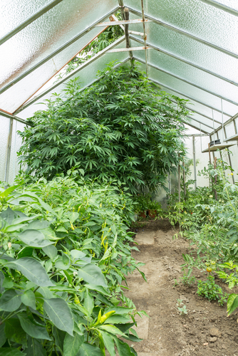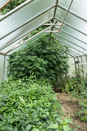 Nog een voorbeeld van een keurige kaskweek. Aan de buitenkant groeien de tomaten terwijl de wietplanten mooi verdekt opgesteld staan in het midden van de kas. Ook deze planten zullen nog wel flink groter geworden zijn!
