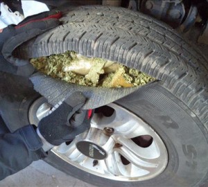 Voor degenen die graag een onsje meer hebben is de autoband wellicht een goede verstopplaats. Hoewel? De wiet van degene op deze foto’s is dus wel ontdekt… En daarbij komt dat het misschien ook wel erg opvalt als je een autoband meeneemt als handbagage.