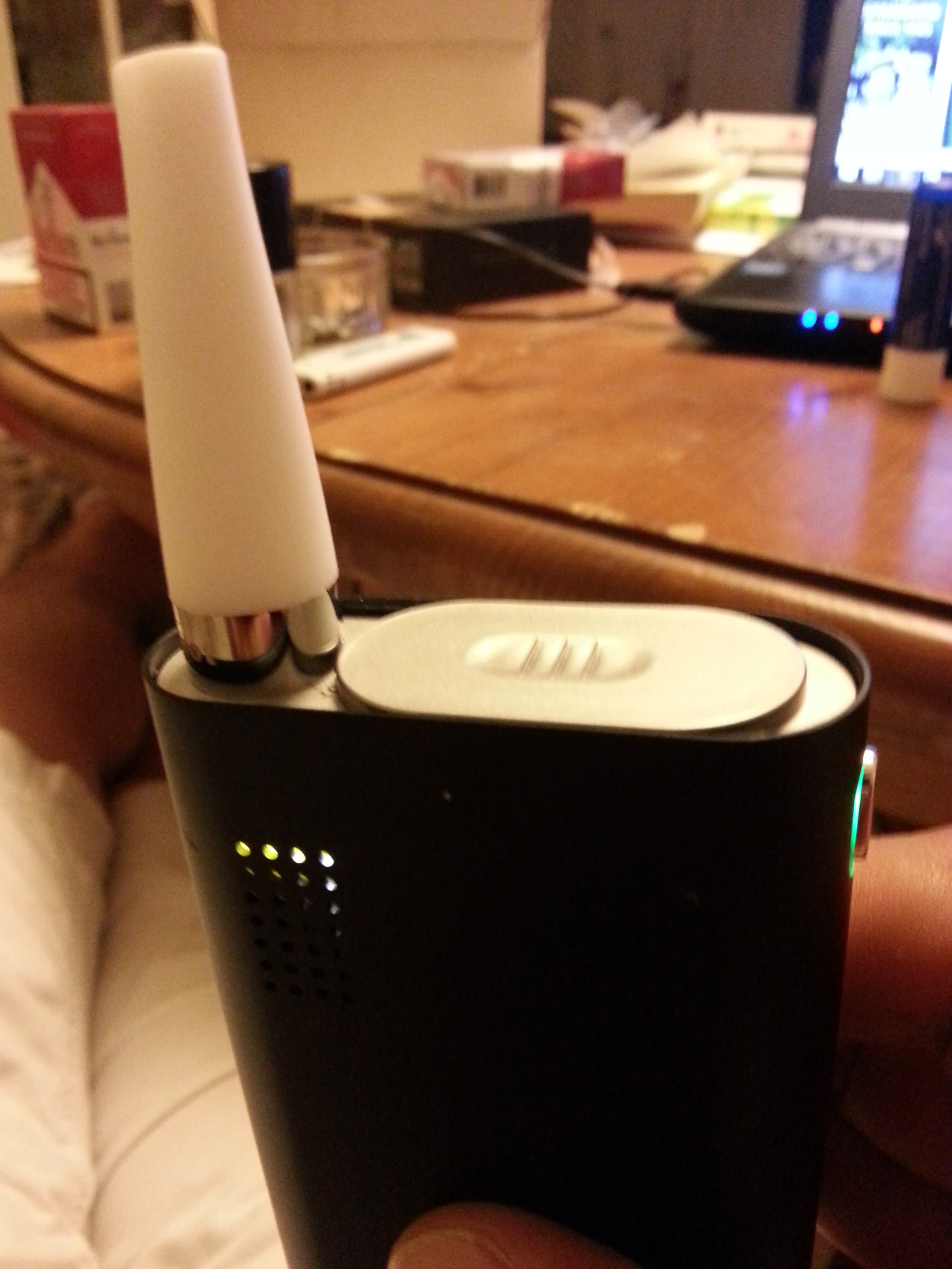 Tijdens het vullen komt al een klein beetje heerlijk geurende damp vrij zoals je ziet. Maar er komt meer dan genoeg damp van het kleine beetje wiet wat ik erin deed. Verdampen is echt heel zuinig met deze verdamper. Uiteraard kun je hem natuurlijk ook vast van tevoren vullen en het mondstuk erop schroeven.