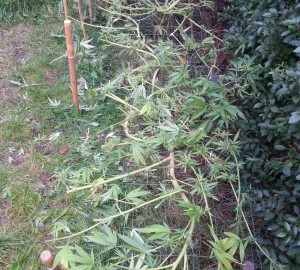 Wat erg leuk was om te zien was dat de kleine buds aan de Frisian Dew plant, door de kou en de regen van afgelopen week prachtig paars waren geworden. Misschien had ik nog een weekje moeten wachten, maar aan de andere kant hadden ze dan wellicht ook veel last van toprot gekregen. Wie zal het zeggen? Ik ben in ieder geval blij dat de toppen veilig en wel binnen zijn. Nadat ik de planten kaal had geknipt zag je heel goed hoe de planten in de laatste zes maanden over het scrog rek gegroeid waren. Het was een heel karwij om ze helemaal van het rek te scheiden. Het totale droge gewicht van de twee buitenwiet planten houden jullie nog van me tegoed, zodra de hele boel droog is zal ik het wegen.