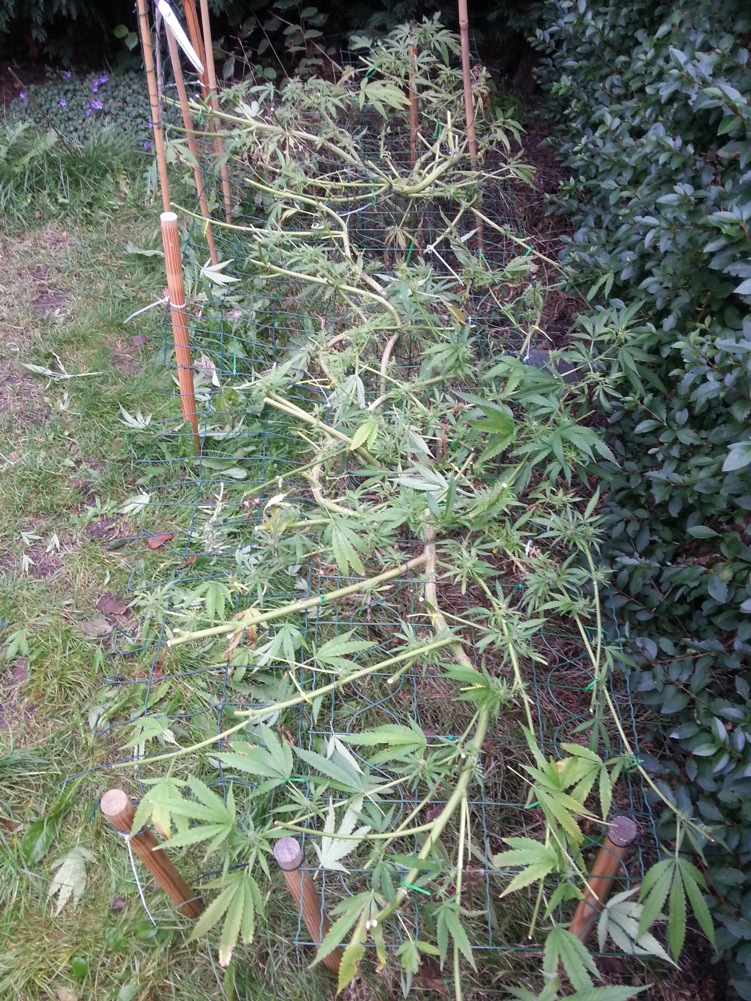 Wat erg leuk was om te zien was dat de kleine buds aan de Frisian Dew plant, door de kou en de regen van afgelopen week prachtig paars waren geworden. Misschien had ik nog een weekje moeten wachten, maar aan de andere kant hadden ze dan wellicht ook veel last van toprot gekregen. Wie zal het zeggen? Ik ben in ieder geval blij dat de toppen veilig en wel binnen zijn. Nadat ik de planten kaal had geknipt zag je heel goed hoe de planten in de laatste zes maanden over het scrog rek gegroeid waren. Het was een heel karwij om ze helemaal van het rek te scheiden. Het totale droge gewicht van de twee buitenwiet planten houden jullie nog van me tegoed, zodra de hele boel droog is zal ik het wegen.