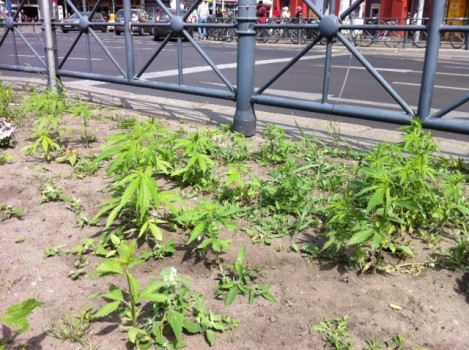 De betreffende rotonde in Berlijn, met nog wat schamele restanten van de 700 wietplanten