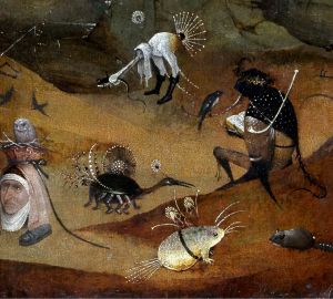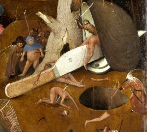 Kijk bijvoorbeeld naar een van de vier ‘Visioenen van het hiernamaals’ panelen uit Venetië, ‘De tenhemelopneming van de gelukzaligen’. Bosch is de eerste schilder die het beeld van een ’tunnel naar het licht’ gebruikte, een beeld dat terug komt in vrijwel alle beschrijvingen van bijna-doodervaringen. Of neem één van de primeurs op de tentoonstelling, de tekening ‘Hellelandschap’, afkomstig uit een privécollectie en voor het eerst te zien. Een bad trip op papier, met een waanzinnige, monsterlijke machine als middelpunt.