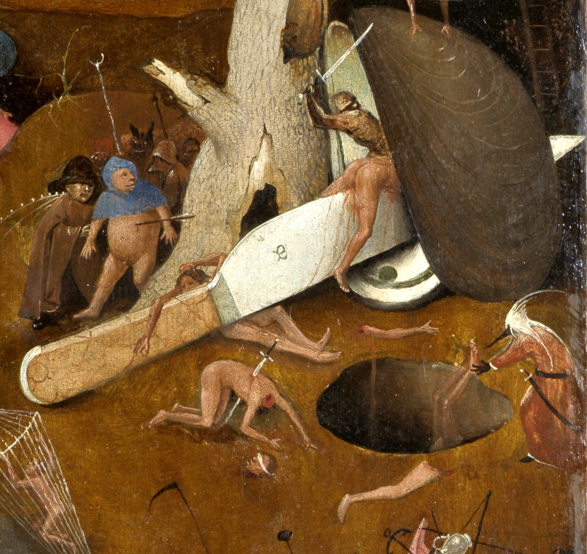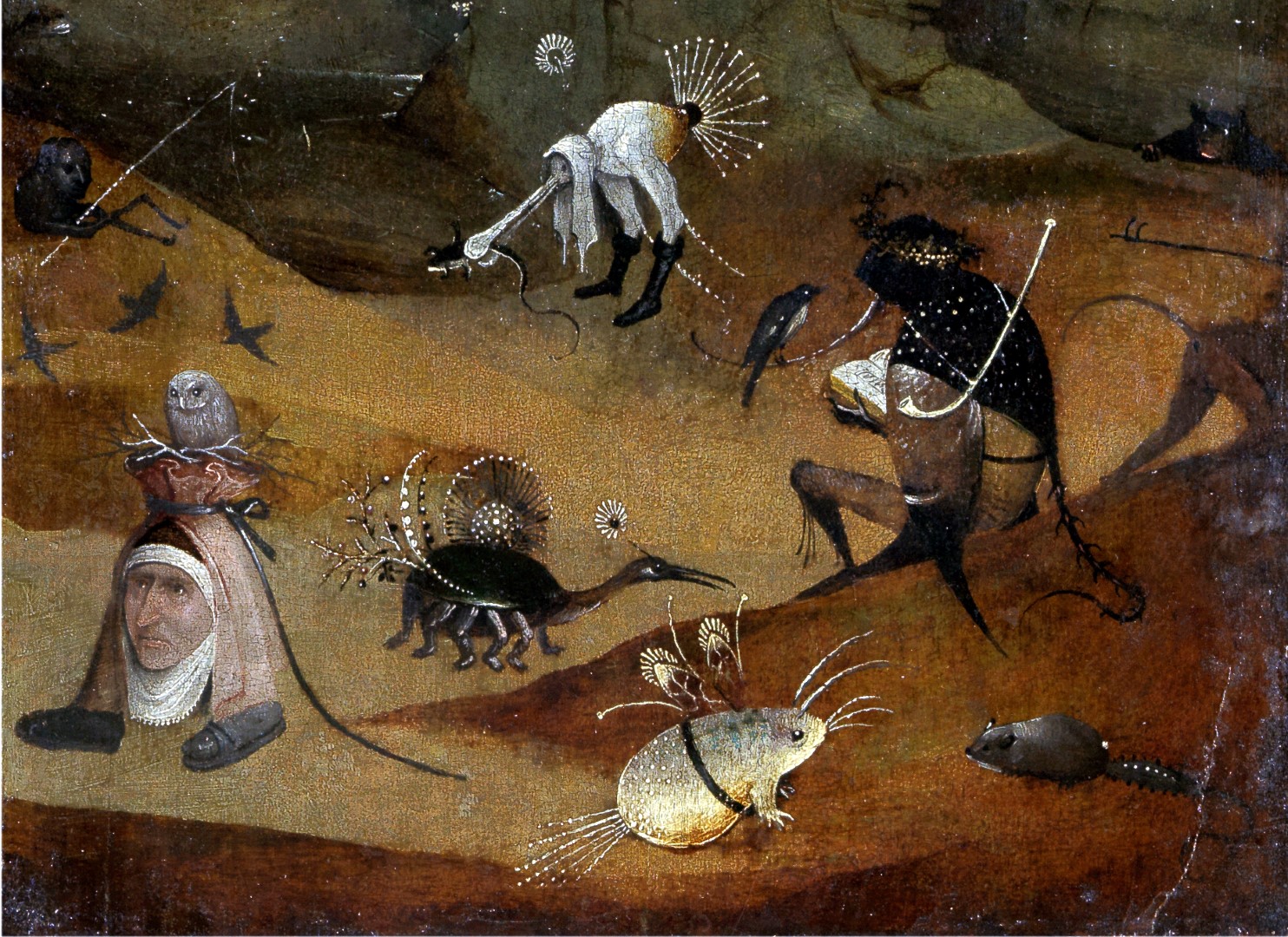 Kijk bijvoorbeeld naar een van de vier ‘Visioenen van het hiernamaals’ panelen uit Venetië, ‘De tenhemelopneming van de gelukzaligen’. Bosch is de eerste schilder die het beeld van een ’tunnel naar het licht’ gebruikte, een beeld dat terug komt in vrijwel alle beschrijvingen van bijna-doodervaringen. Of neem één van de primeurs op de tentoonstelling, de tekening ‘Hellelandschap’, afkomstig uit een privécollectie en voor het eerst te zien. Een bad trip op papier, met een waanzinnige, monsterlijke machine als middelpunt.