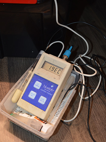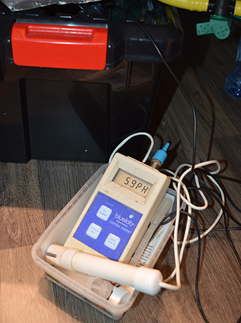 Mijn kraanwater heeft een EC-waarde van 0,9 en na toevoeging van de voeding werd dat 1,9. De pH-waarde is stabiel en hou ik zoveel mogelijk rond de 5,8. De temperatuur van het water hou ik met een kleine aquariumverwarming rond de 21 graden.