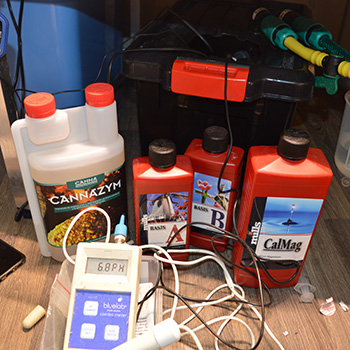 Daarna heb ik het systeem weer geleegd en opnieuw met water gevuld, de aquariumverwarming weer aangezet en de plantjes in het systeem geplaatst. Vervolgens heb ik er Mills Start, CalMag, wat Vitalize, Mills A en B groeivoeding en CannaZym aan toegevoegd. Na de groeifase ga ik over op Canna Aqua Flora A en B voor de bloeifase. Ik zou het liefste ook groeien op de Canna Aqua lijn maar daar kon ik niet zo snel aankomen, vandaar dat ik nu nog even start op de groeivoeding van Mills. Dit is de vorige ronde ook helemaal goed gegaan dus waarom niet?