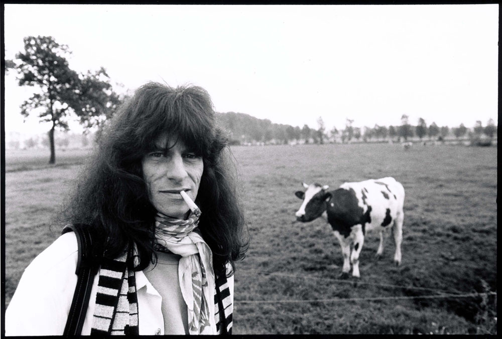 Het werd een onvergetelijke middag, waarbij Armand en ik steeds stoneder werden, terwijl we het Brabantse landschap doorkruisten. Zagen we ergens een paar fotogenieke koeien of een goed weiland, dan stapten we uit, rookten een blow en gingen aan de slag. Ik schoot de foto’s in zwart-wit, waardoor ze ouder lijken dan ze zijn. Ik hoefde Armand niet te vragen om een joint tussen zijn lippen of vingers te houden voor de foto; daar zorgde hij zelf wel voor.