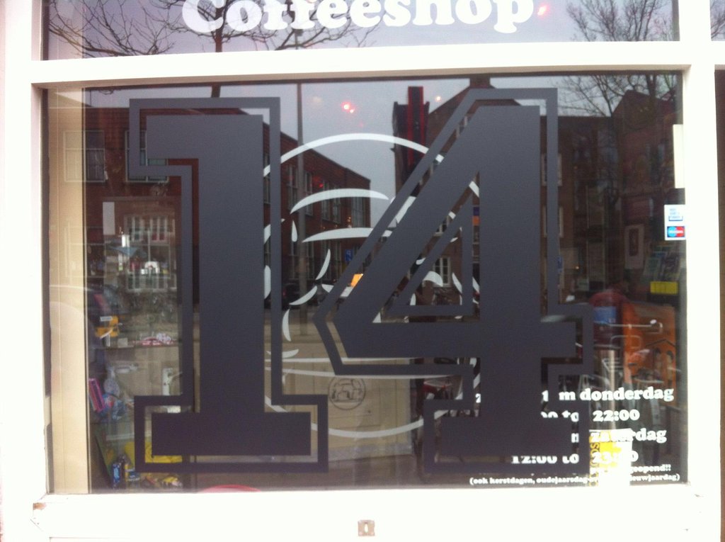 En ineens prijkte er een levensgroot cijfer 14 op de etalageruit van coffeeshop Anna in Purmerend. Nee, niet omdat deze cannabiszaak in Noord-Holland toevallig haar 14e verjaardag viert – de shop bestaat namelijk precies de helft zolang deze maand – maar omdat 14 het rugnummer van J.C. is natuurlijk!