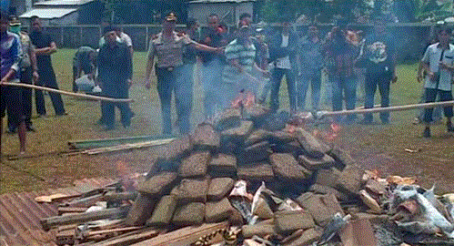 De politie in Palmerah, stelletje koekenbakkers dat het zijn, besloot eerder deze maand om eens demonstratief 3.300 kilogram cannabis in de hens te steken. Helaas hielden de agenten weinig rekening met de wind, dus de enorme rookwolken dreven richting dorp. Naar verluidt klaagden de inwoners en verzamelde journalisten een stevig potje over duizeligheid, hoofdpijn en vergiftiging. Gezien de rookpluimen op de foto’s geloven we dat wel.