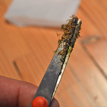 Na een tijdje knippen, merk je waarschijnlijk dat je schaar niet meer zo soepeltjes knipt. Hars heeft zich op de bladen van je schaar verzameld en hij plakt als de neten. Probeer het er niet af te wassen met water en zeep of alcohol, maar pak er een scherp mesje bij en schraap de plakkerige hars van de schaar. Wat je overhoudt is ‘schaartjes’; eerste kwaliteit hasj en de allereerste joint van je oogst. Wanneer er veel bloeiharen en ander plantmateriaal doorheen zit, kun je de hasj zuiverder maken en tot een heerlijke rosin persen.