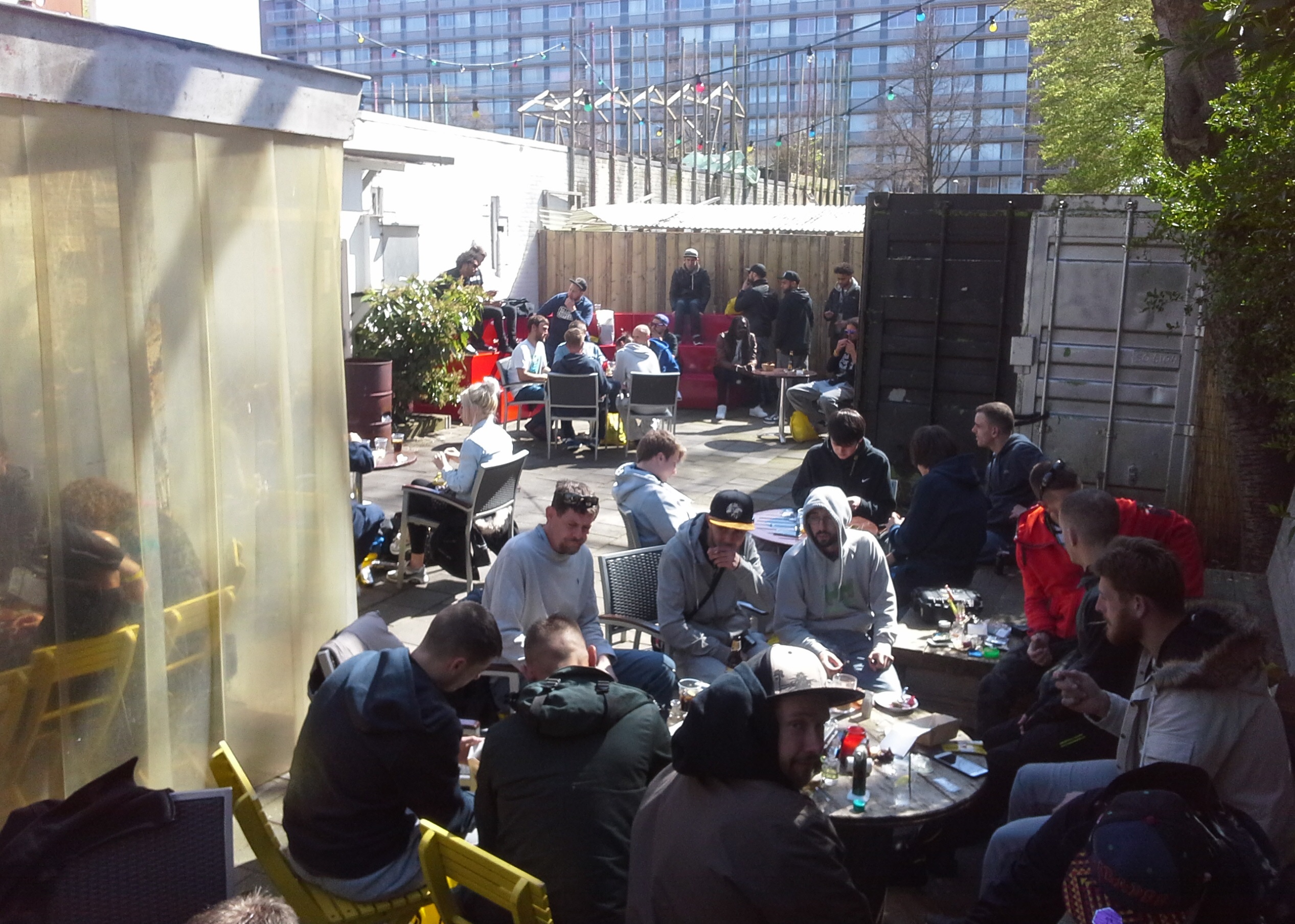 Na een tafeltje in het heerlijke lentezonnetje te hebben geslepen, moest dan toch als eerste een jointje worden opgestoken. Het duurde dan ook niet lang tot er wat mensen zich bij ons gezelschap voegden, waardoor we al wat makkelijker op onze plaats zaten. Er waren zeker wat bekenden, maar ik denk dat er niet een van hun de Nederlandse