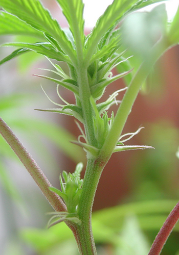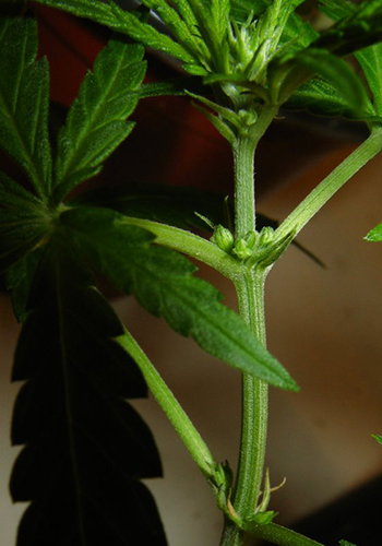 Kweek je wiet uit niet-gefeminiseerde zaden, let dan aan het begin van de bloeifase goed op je planten. Sommigen zullen mannelijk blijken te zijn, en deze ‘heren’ moet je verwijderen voordat ze hun stuifmeel loslaten. Je herkent mannelijke en vrouwelijke wietplanten door goed te kijken naar de eerste bloeiverschijnselen in de oksels van de zijtakken, ook wel nodes genoemd. Bij mannelijke wietplanten groeien hier een soort kleine balletjes (knopjes), terwijl je bij vrouwelijke planten druppelvormige zaadzakjes ziet van waaruit twee bloeihaartjes groeien. Op de foto’s hieronder zie je het verschil.