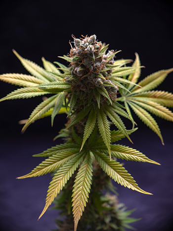 Close up van een oogstrijpe top, de trichomen zijn wit en de bloeiharen bruin. Foto: Canna Obscura, Shutterstock