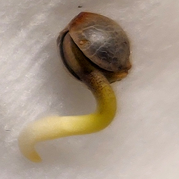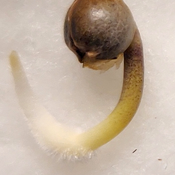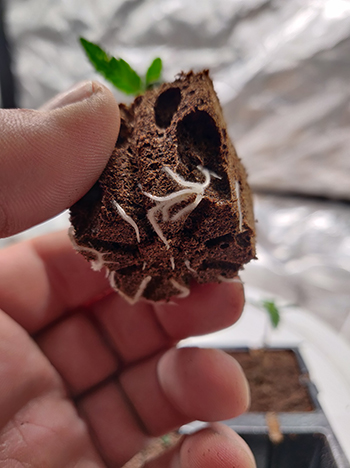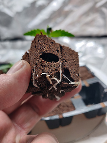 Na 24 uur in het water zijn alle zaden ontkiemd en hebben we ze tussen vochtige wattenpads gelegd, tot ze een mooie penwortel van gemiddeld ongeveer een centimeter lang hadden. Met de penwortel groot genoeg zetten we ze in Eazy Plug blokjes, die we vooraf ingewaterd hebben met een mengsel van water en Hortifit Root starter. De verhouding die we gebruiken is aangegeven op de fles en is 1:100 (10 milliliter per liter water). En met de zaailingen in hun pluggen kunnen ze onder de lamp.