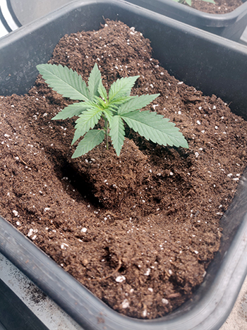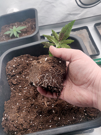 Na vier dagen ongekend snelle groei, zijn er aan de zijkanten en de onderkant van de Eazy Plugs al wortels te zien. Tijd om de zaailingen te verplaatsen naar een groter onderkomen! We hebben ze verpot naar 0,7-literpotjes en vanaf dit moment geven we ze ook wat meer voeding. De voeding die we voor deze ronde gekozen hebben, is Hy-Pro Hydro A+B. Van beide componenten gebruiken we momenteel 2,5 milliliter per liter water.