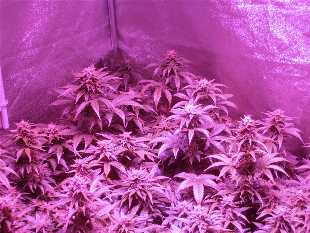 Verder gaat alles prima, langzaam worden ze geler maar dat gaf ik vorige week al aan. De toppen zetten goed aan, ondanks het afbloeien onder led, waar de meeste kwekers huiverig voor zijn. Mij bevalt het prima. Normaal zou je denken, led is ideaal voor groei en de eerste bloeiweken en daarna zakt het als een kaartenhuis in elkaar. Toppen zetten niet door, toppen blijven niet hard en worden niet dikker. Dat valt me nu toch echt mee. Want ze zijn, en blijven maar LOEIHARD! Best vreemd eigenlijk. Dus dit is eindelijk eens een led lamp (met stevig prijskaartje) die het wel goed doet. De toppen dikken aan en dat is op het eind van de week toch goed te zien, dus 6 VOLLE weken onder een Budmaster kweeklamp gaat als een trein.