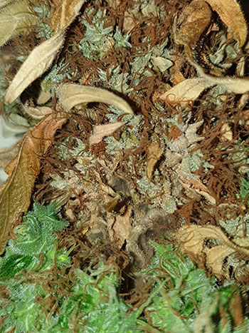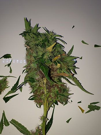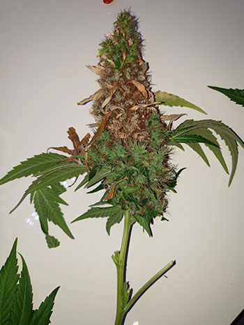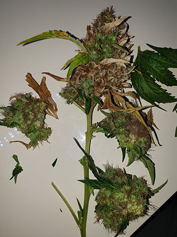 Helaas bleek dat niet de reden van de bruine verkleuring. Tijdens het wegknippen van de bladeren zie ik tot mijn verbazing namelijk iets pluizigs in de top. Shit nee! Het is toprot! Dit had ik totaal niet verwacht omdat de lucht toch aardig droog was in de kweekkast. Na het schoonmaken (ontsmetten) van mijn gereedschap begon ik wat huiverig aan de volgende top…