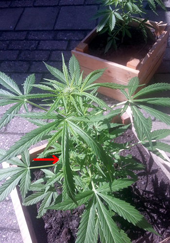 Van de drie AutoMazar planten bloeien er twee en één nog niet. Lijkt gek hè? Aangezien het toch dezelfde soort is. Het komt ook niet zo vaak voor maar ik denk dat het een genetisch ‘probleempje’ is. De plant die nog niet bloeit is denk ik gewoon een afwijkend fenotype. Dit kan aan het einde van de cyclus trouwens nog veranderen in een voordeel. Omdat de plant een langere groeiperiode heeft genoten, zal ze waarschijnlijk ook een stukje groter worden dan de andere twee planten en dus ook meer opbrengen. Wanneer je trouwens goed kijkt kun je op de foto al wel de eerste bloeiharen zien. Ik heb even ingezoomd op de foto die je stuurde, kijk zelf maar. Het dunne witte haartje waar de rode pijl naar wijst is een van de eerste bloeihaartjes. Het zal niet meer lang duren voor deze dame ook gaat bloeien!