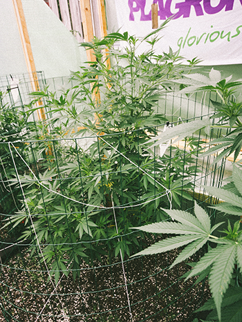 Onze opstelling met grote smart pots doet zijn werk, wat onder de grond aan rijkheid in voeding wordt geboden zien we aan de bovenkant in vele gezonde en rijke takken terug. De planten zien er ontzettend gezond uit en lijken per week in formaat te verdubbelen. We hebben er daarom bewust voor gekozen om iedere week een plant bij te zetten. We onthullen nog even niet welke soort er in de grootste 1000-literpot (300 gallon!) staat, maar laten wel graag zien hoe fruitig ze er nu al bijstaat in haar kooitje…