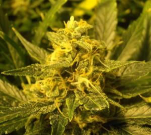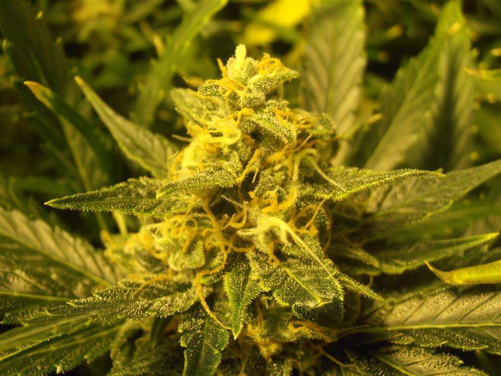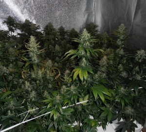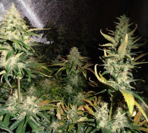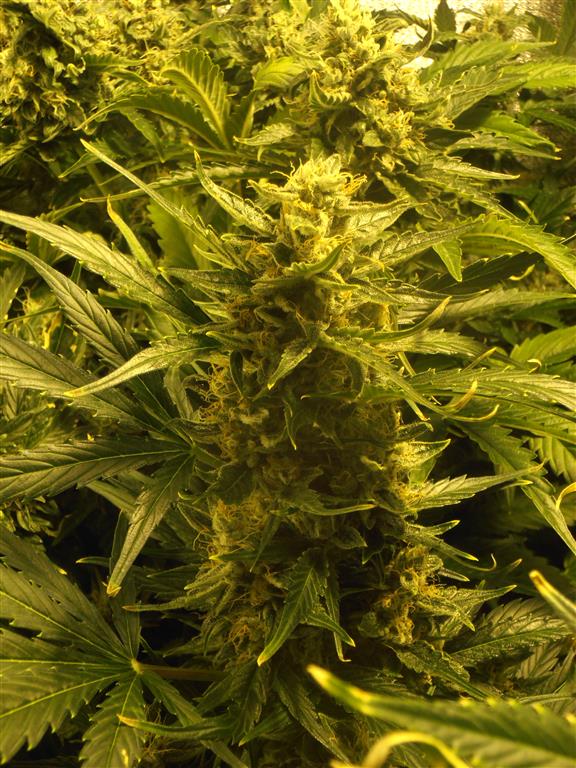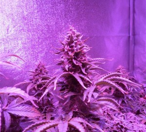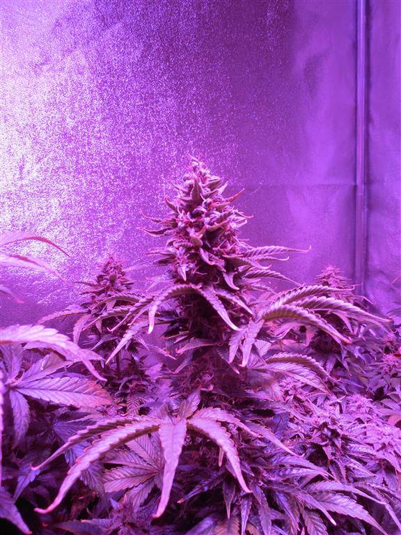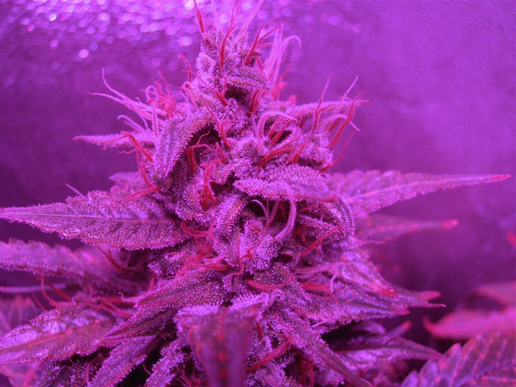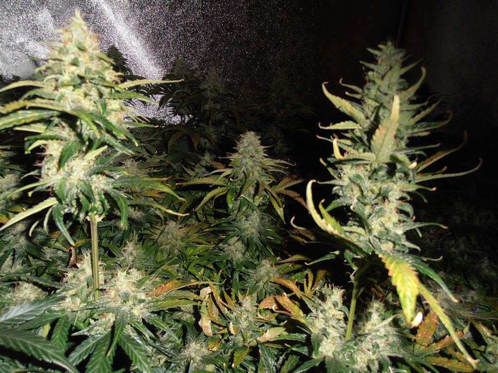 Geweldig toch, om zo’n vergelijking te kunnen laten zien. Tot slot laat ik nog wat foto’s zien terwijl de lamp even is uitgegaan. Hier heb ik toch dikke mooie besneeuwde toppen vol THC waar ik stiekem toch behoorlijk trots op ben. Bij het aanraken van de plant komt er een geweldige zoete frisse geur vrij. Een geur die na veelvoudig wassen nog steeds in mijn poriën verstopt zit omdat ik het 2 uur later nog ruik! En ik blijf snuffelen zo lekker is deze soort.