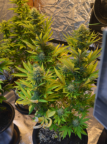 Hier en daar zitten er nog wel wat oude gele bladeren aan de planten maar die haal ik pas weg wanneer ze helemaal afgestorven zijn. Als ik ze nu weg zou halen zou ik de stammen kunnen beschadigen en de planten onnodig stress kunnen geven. Bovendien fungeren de vergeelde bladeren nog steeds als een reserve voor de planten, die ondanks alles gewoon doorgaan met het fabriceren van toppen. Zoals je op de foto’s kunt zien zijn ze ook al bezig met de aanmaak van THC.