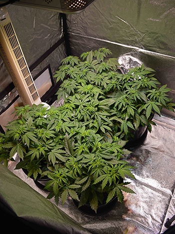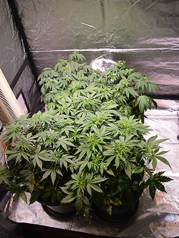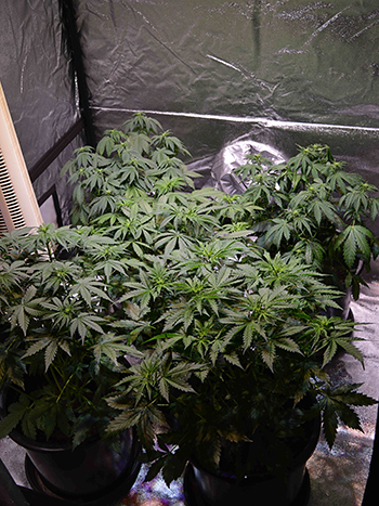 De bloei is trouwens ook begonnen, al kun je daar op de foto’s nog niet veel van zien. Ik heb daarom ook de bloeischakelaar weer aangezet. Deze keer reageren ze daar gelukkig wel goed op, en nu de lamp ook wat hoger hangt, kunnen de planten wat meer uit elkaar zonder dat ze licht tekort komen. Ze beginnen elkaar namelijk echt wel een beetje te verdringen nu ze wat groter zijn. Nog een week of vijf, zes en dan zouden ze volgens de planning klaar moeten zijn voor de oogst maar we weten allemaal dat de theorie en de praktijk wat dat betreft niet altijd in harmonie is. Ik hou altijd wel rekening met een weekje blessuretijd.