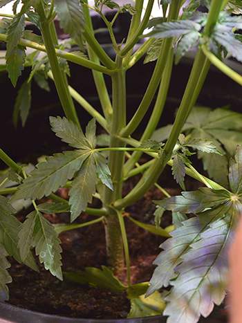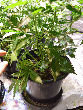 Let er dus op als je met een ledlamp kweekt die ook zo’n aparte groei- en bloeischakelaar heeft, dat je de bloeischakelaar alleen tijdens de bloeifase gebruikt. Het is verleidelijk om te denken dat meer licht voor een betere groei zorgt maar dan kun je bedrogen uitkomen. Hier nog even een foto van twee weken geleden om de schade te laten zien.