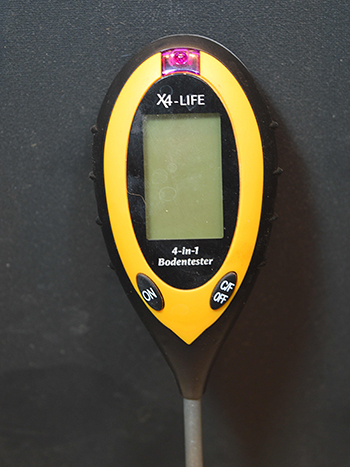 Helaas heb ik me daarnaast een keer vergist, en de planten teveel water gegeven. Ik moet nu dus even wachten tot de dames weer wat droger staan. Een geluk bij een ongeluk dus dat de temperatuur overdag wat hoger is, want daardoor is de aarde weer snel droog geworden. Om dat te controleren, heb ik een bodemtester in de grond geprikt. Deze meet niet alleen het vochtgehalte maar ook de temperatuur, de pH-waarde en de lichtintentie.
