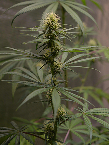 Barney telt de vijfde week van de zichtbare bloei en verwent zijn planten met zoveel mogelijk licht en een slokje Green Sensation. De ‘HPS Killer’ ledlamp staat op volle kracht aan, maar om schade door ledburn te voorkomen houdt hij die nog wel voorzichtig op afstand.