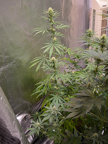 Omdat de planten nu vol in bloei staan heb ik de ‘HPS Killer’ ledlamp ook vol aangezet. Hij hangt 50 centimeter boven de planten en het ziet er goed uit. Onderin groeien wat vergeelde bladeren maar dat heeft aan de ventilator gelegen. Het is niet de ideale ventilator voor wietplanten dus ik zoek op Marktplaats naar een andere.