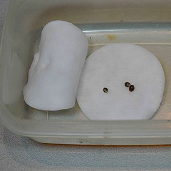 Barney heeft een beetje pech gehad met zijn wietzaadjes deze week. Twee van de vijf zijn nog steeds niet boven de grond, en dus gaat het deze week nog eens over ontkiemen. Om snel twee nieuwe zaailingen te hebben gebruikt Barney daarvoor wattenschijfjes én …waterstofperioxide?