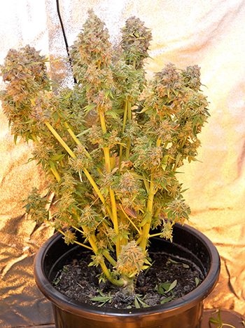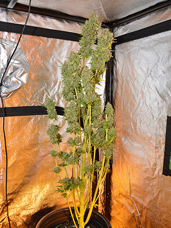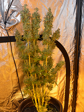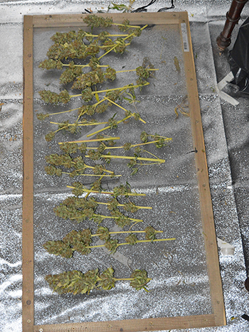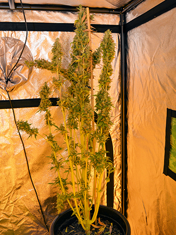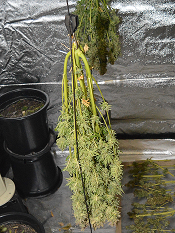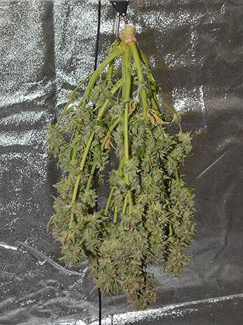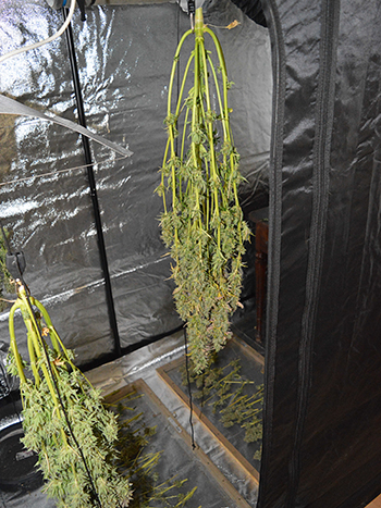 Zondag ben ik aan de oogst van de eerste twee planten begonnen en heb ik ze te drogen gelegd in mijn droogkast. De andere drie planten heb ik toen nog even laten staan; mijn droogkast heeft een eigen filtersysteem zodat je buiten de kast geen wietlucht ruikt tijdens het drogen. Maandag werd het me echter duidelijk dat het filter in de droogkast niet meer zo goed werkte. Ja en de enige oplossing is dan om de planten toch maar in de kweektent drogen, dát filter werkt tenminste nog wel.