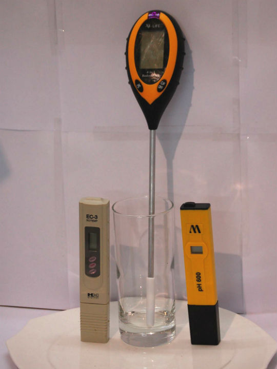 Citroenzuur om af te zuren en de nodige meetapparatuur. Barney gebruikt een EC en pH meter voor het aanmaken van voedingswater en de bodemtester is om de hoeveelheid water in de aarde te meten.