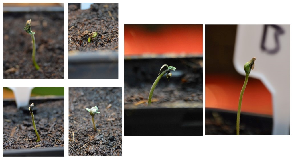 Ik heb foto’s gemaakt van de kleintjes en zoals je kunt zien gaat het niet met alle zaailingen even lekker, een paar hebben moeite gehad met opengaan, oftewel het wegduwen van het schilletje van het zaadje. Hierdoor zien ze er niet zo mooi uit, maar als je goed naar de foto’s kijkt zie je wel dat sommigen al gewoon doorgaan. Als iets niet lukt bij een plant slaat deze de stap gewoon over en gaat met de volgende stap verder. In dit geval dus het aanmaken van de eerste gekartelde wietblaadjes.