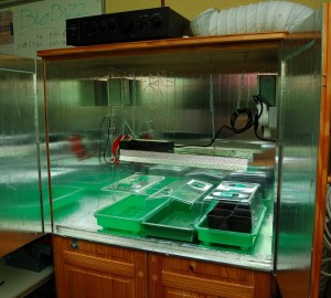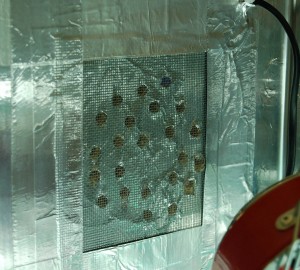 Toen de droogkast helemaal naar mijn zin was, heb ik me op de groeikast gestort. Deze heb ik in het bovenste deel van de kast ingericht. Eerst heb ik de hele bovenkant van de kast aan de binnenkant beplakt met aluminiumtape voor een goede reflectie van het licht. Het beschermt tevens ook het hout van de kast tegen vochtige lucht. Omdat ik altijd een lekker muziekje voor mijn planten draai – ja, ik verwen mijn dames goed hoor – heb ik ook twee kleine speakers in de groeiruimte opgehangen.