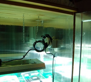 Aan twee haakjes en kettingen hangt de motor van mijn groeikast; 2 x 55 Watt T-Neon in de kleur 6500K. Omdat ik niet wil dat het in mijn groeiruimte te warm wordt en ik al helemaal geen brandgevaar wil veroorzaken, heb ik drie computerventilators in de kast gemonteerd die ook hier de gebruikte lucht en warmte afvoeren. Een snelle test leerde me dat de temperatuur in de groeikast met de lamp aan nu ongeveer 26 graden blijft, een prima temperatuurtje voor mijn plantjes dus! Ik zou de koeling regelbaar kunnen maken met een dimmer maar dat komt nog wel. Nu is het geld op haha.