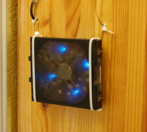 Zo zitten de PC fans gemonteerd, eentje blaast lucht in en twee anderen zuigen lucht uit de groeiruimte