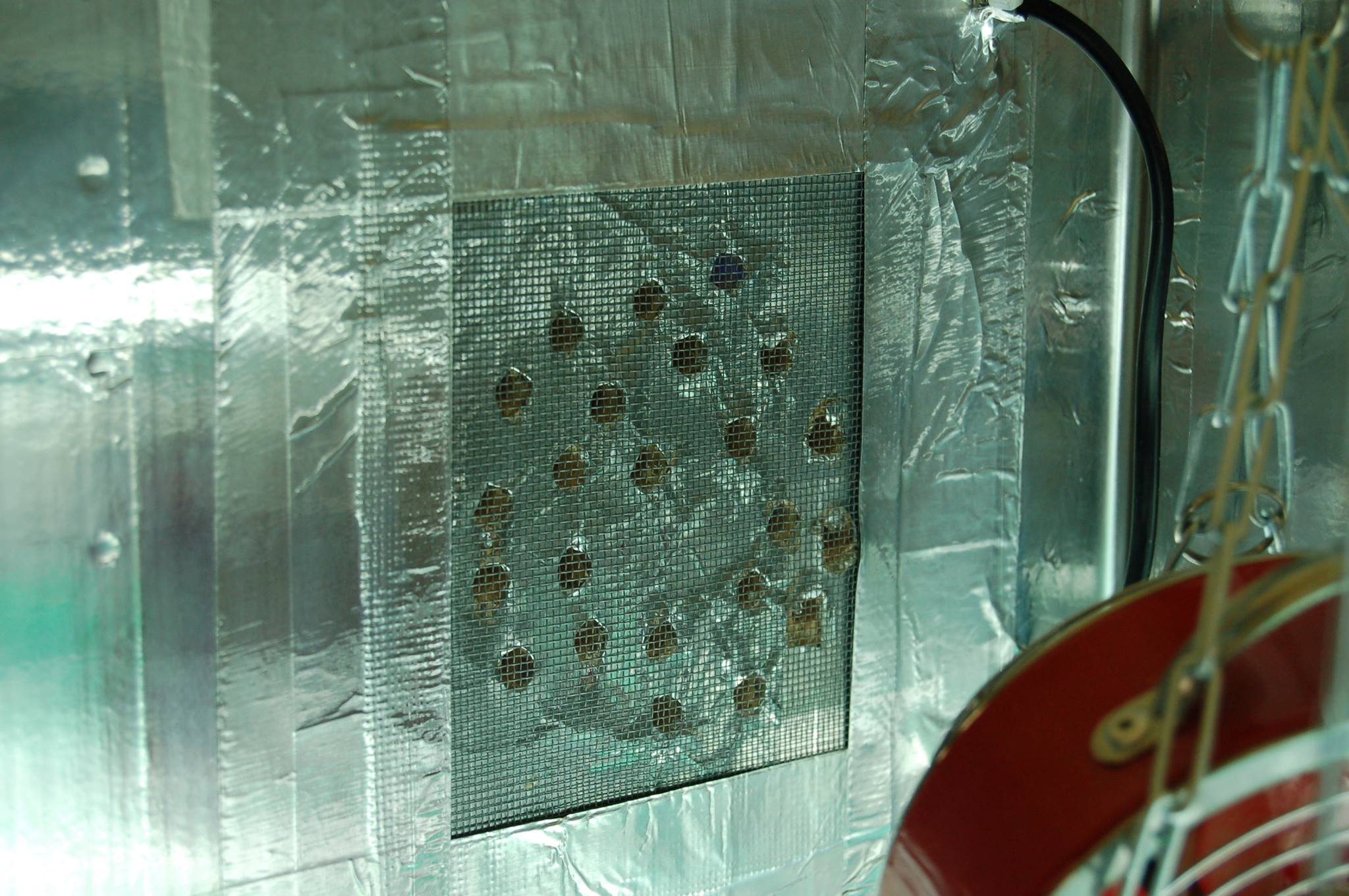 Via een gat in de zijkant voer ik door een koolstoffilter met een afzuiger lucht af uit de droogruimte. Het koolstoffilter voorkomt dat je de drogende wiet buiten de kast ruikt. Een dimmer op de afzuiger zorgt ervoor dat ik de hoeveelheid lucht die per minuut afgevoerd wordt kan regelen. Je wil wiettoppen namelijk niet te snel laten drogen.