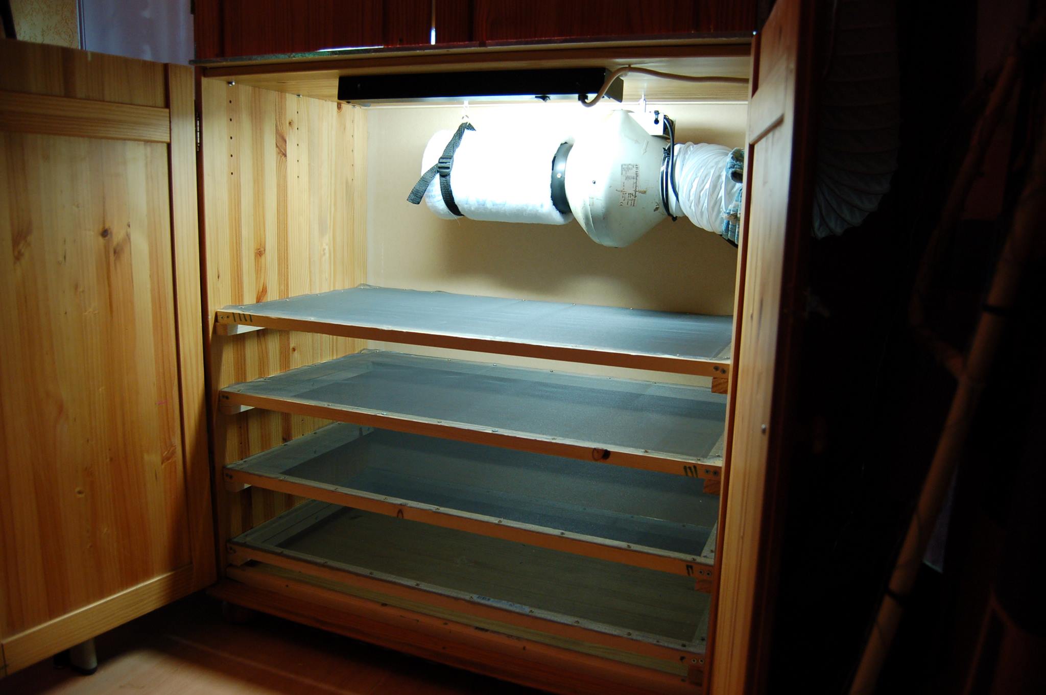 Met wat simpele latjes en wat horrengaas heb ik droogrekken gemaakt, een afzuiger met koolstoffilter zorgt ervoor dat mijn medicijn kan drogen zonder dat je er buiten de kast wat van ruikt