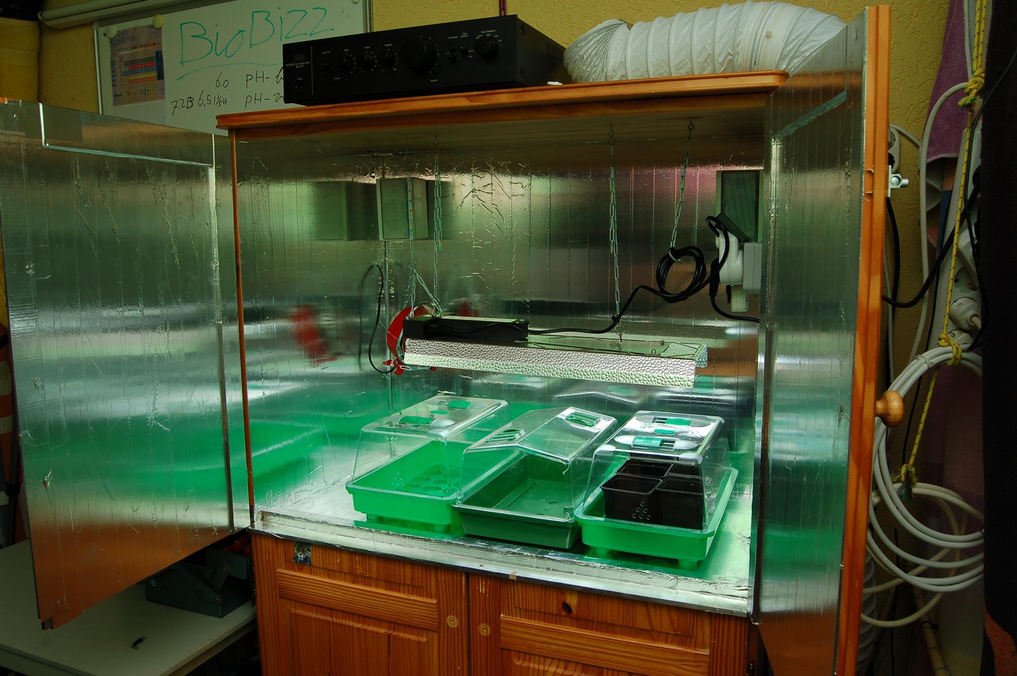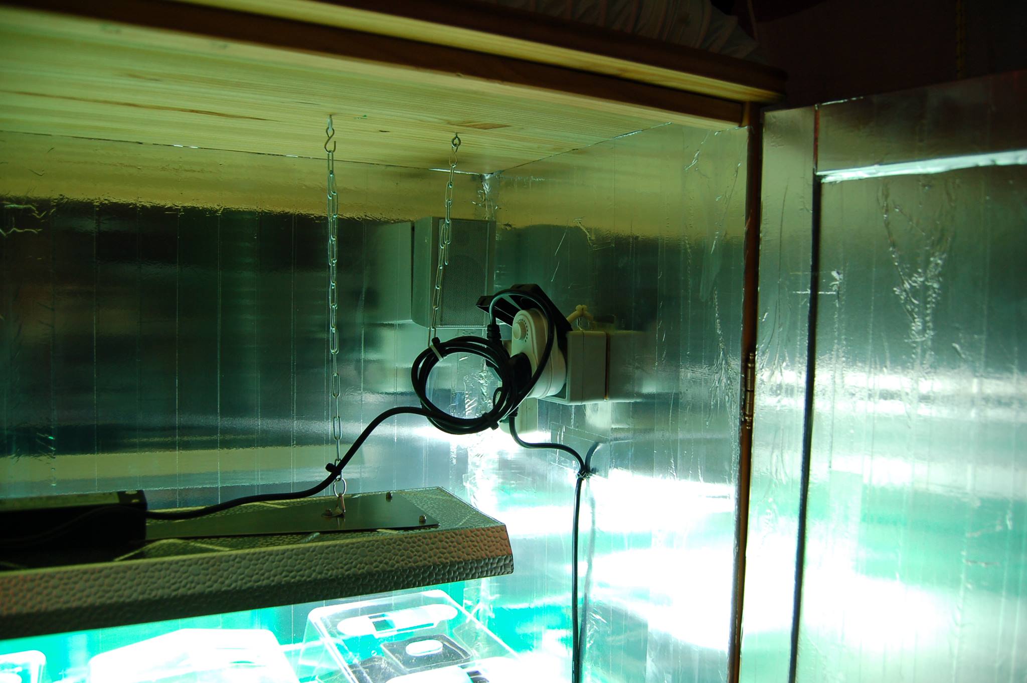 Toen de droogkast helemaal naar mijn zin was, heb ik me op de groeikast gestort. Deze heb ik in het bovenste deel van de kast ingericht. Eerst heb ik de hele bovenkant van de kast aan de binnenkant beplakt met aluminiumtape voor een goede reflectie van het licht. Het beschermt tevens ook het hout van de kast tegen vochtige lucht. Omdat ik altijd een lekker muziekje voor mijn planten draai – ja, ik verwen mijn dames goed hoor – heb ik ook twee kleine speakers in de groeiruimte opgehangen.