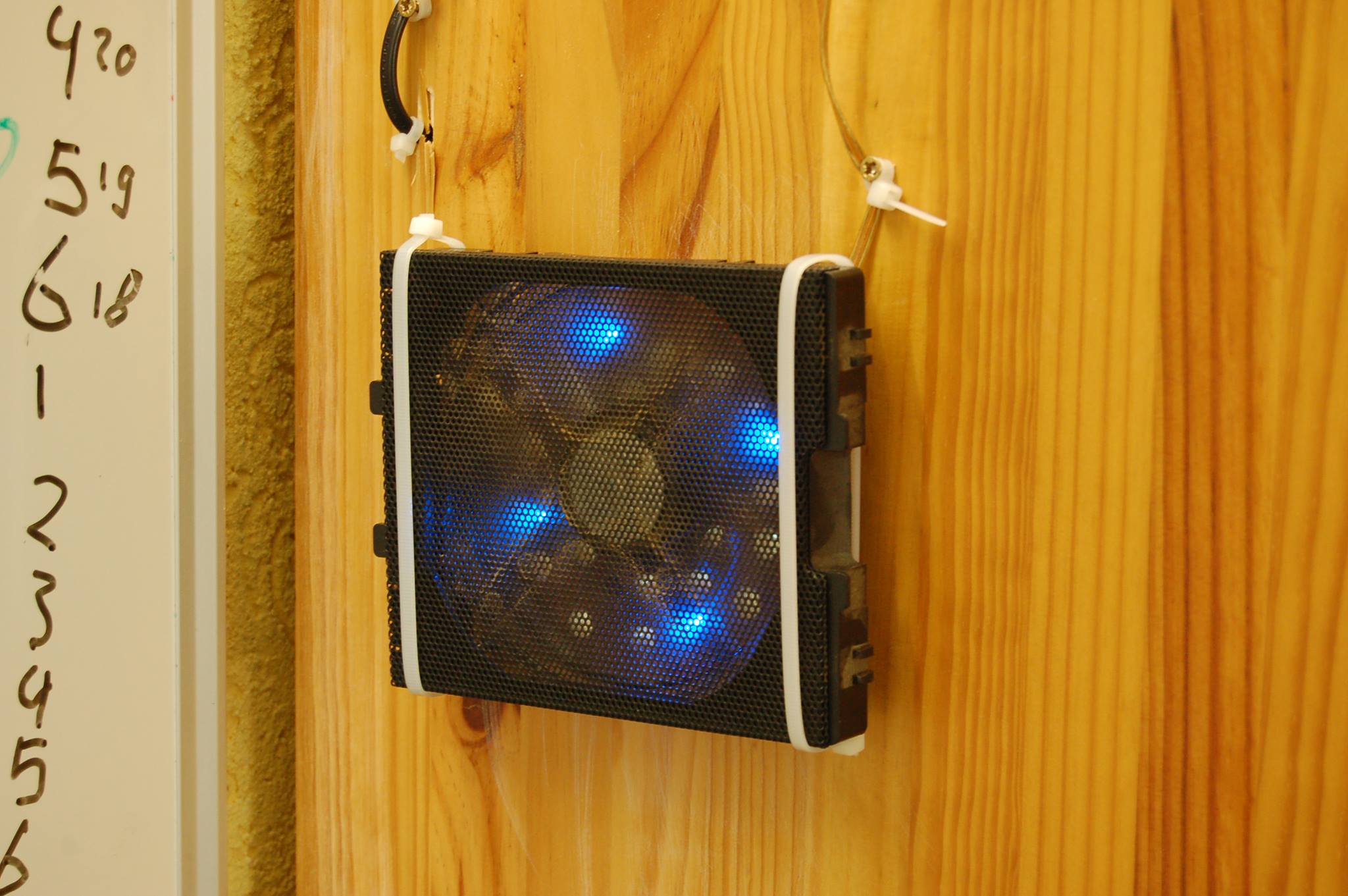 Zo zitten de PC fans gemonteerd, eentje blaast lucht in en twee anderen zuigen lucht uit de groeiruimte