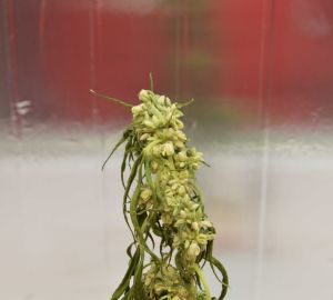 Wel heb ik nog wat van het stuifmeel bewaard, en zal ik om er absoluut zeker van te zijn dat ik op elke plant zaden krijg, een top aan elke plant handmatig bestuiven met een oud penseeltje. Uiteindelijk hoef ik geen bergen met zaad te hebben, dit is een experiment en geen zadenfabriek. Na het afknippen heb ik de mannelijke tak in een glas water gezet in mijn groeiruimte gezet. Zo wilde ik de rest van het stuifmeel opvangen en oogsten voor later. Het liep alleen niet helemaal volgens planning… Er is nog wel een en ander aan mannelijke bloemen open gegaan, maar de tak is na het afknippen vrij snel afgestorven. Het is maar goed dat mannelijke bloemen zoveel stuifmeel produceren dat een klein beetje al meer dan genoeg is. In de natuur waait het grootste deel van het stuifmeel namelijk weg om ergens op de grond te belanden zonder ook maar 1 wiettop te zien. Moeder natuur lost dit op door gewoon ontzettend veel stuifmeel te produceren en de foutmarge zo op te vangen.