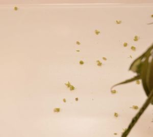 Ik heb de mannelijke tak ongeveer vier dagen laten bestuiven. Iedere avond klopte ik de tak uit voor de ventilator, zodat het stuifmeel goed door de ruimte werd geblazen. Na deze vier romantische avondjes voor planten vond ik het welletjes en heb ik de mannelijke tak afgeknipt. Waarom? Zul je denken, dat zal ik uitleggen. Zoals je op de foto kunt zien heeft de tak behoorlijk veel bloemzakken met stuifmeel. Omdat ik ook nog van de wiet wil roken en een Bud vol met zaad, ja dat is weinig roken. Daarom heb ik het bestuiven beperkt tot slechts 4 dagen. Er zijn ongeveer 15 mannelijke bloemen open gegaan en ik denk dat dat genoeg is voor een hand vol zaad.