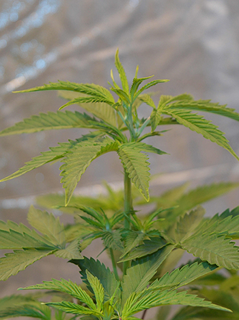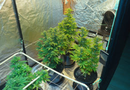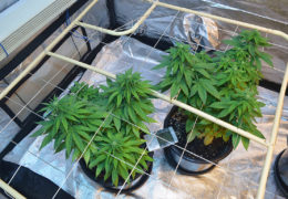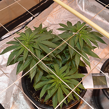 Mochten de drie planten onder de HPS te hoog worden, dan buig ik ze om (supercroppen) en maak ik ze vast aan een stuk bamboe. Bij de twee planten onder de led heb ik een screen-of-green- ofwel SCROG-rek hangen om de planten kort te houden. Wanneer ze door het rek heen groeien bind ik ze eraan vast en blijft alles op de zelfde hoogte en wordt het licht zoveel mogelijk benut.