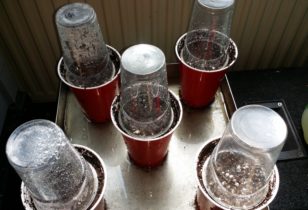 Hou als je dit doet wel goed in de gaten of de plantjes boven de grond komen. Door de condens aan de binnenkant van het bekertje is dat toch wat lastiger te zien soms, en je wilt liever niet dat de plantjes te lang groeien onder de beker.
