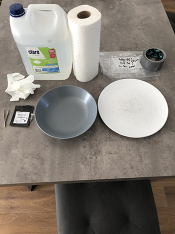 Ten eerste doe ik de handschoenen aan omdat ik voorkomen wil dat bacteriën van mijn handen op de zaden komen. Dan giet ik gedestilleerd water in een schaal en maak een vel keukenpapier daarin nat. Dan knijp ik het overtollige water met mijn vingers uit, zodat ik een goed vochtig keukenpapier heb. Dit vouw ik doormidden en leg het vlak op een bord. Dan neem ik met de pincet de zaden en plaats hun een voor een met een afstand van ruim twee centimeter ertussen, op een helft van het vochtige keukenpapier.