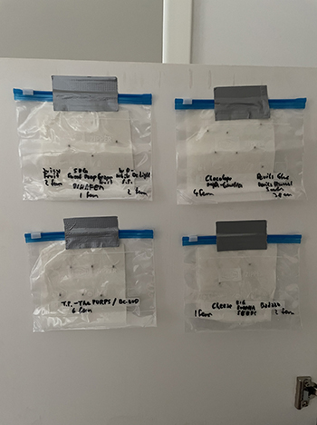 Nu komt het vel ter grootte van een kwart van het keukenpapier in het plastic zakje met rits. Ik schuif het voorzichtig zo in het zakje dat de punten van de zaden naar beneden wijzen als je het zakje ophangt. Dan sluit ik de rits en plak ik het zakje aan de binnenkant van een deur van een kast die ik bijna nooit open doe. De zaden moeten in het donker ontkiemen!